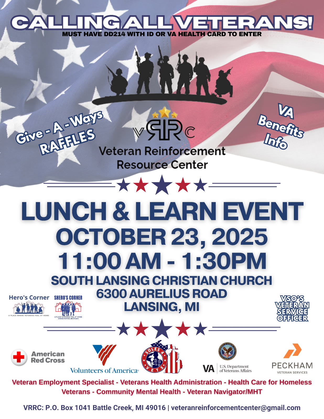 - 10/23/25, 11:00am - 1:30pm, Lunch & Learn Event, South Lansing Christian Church, 6300 Aurelius Rd. Lansing, MI 48911. This event is for veterans. Note that proof of service is required for entry in the form of a DD214 with ID or VA Health Card.